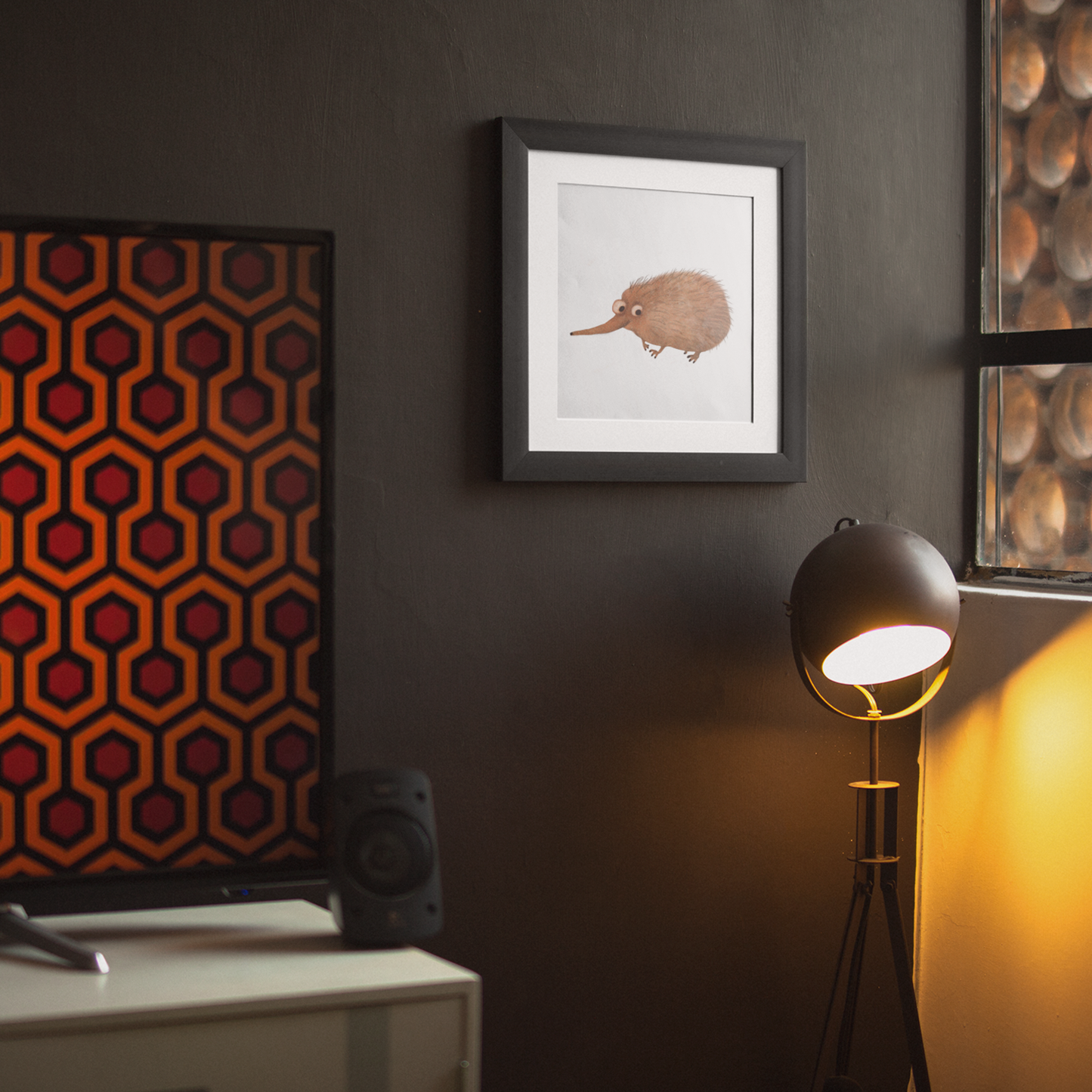Prints can be hung with double-sided tape, tacks, or be framed.