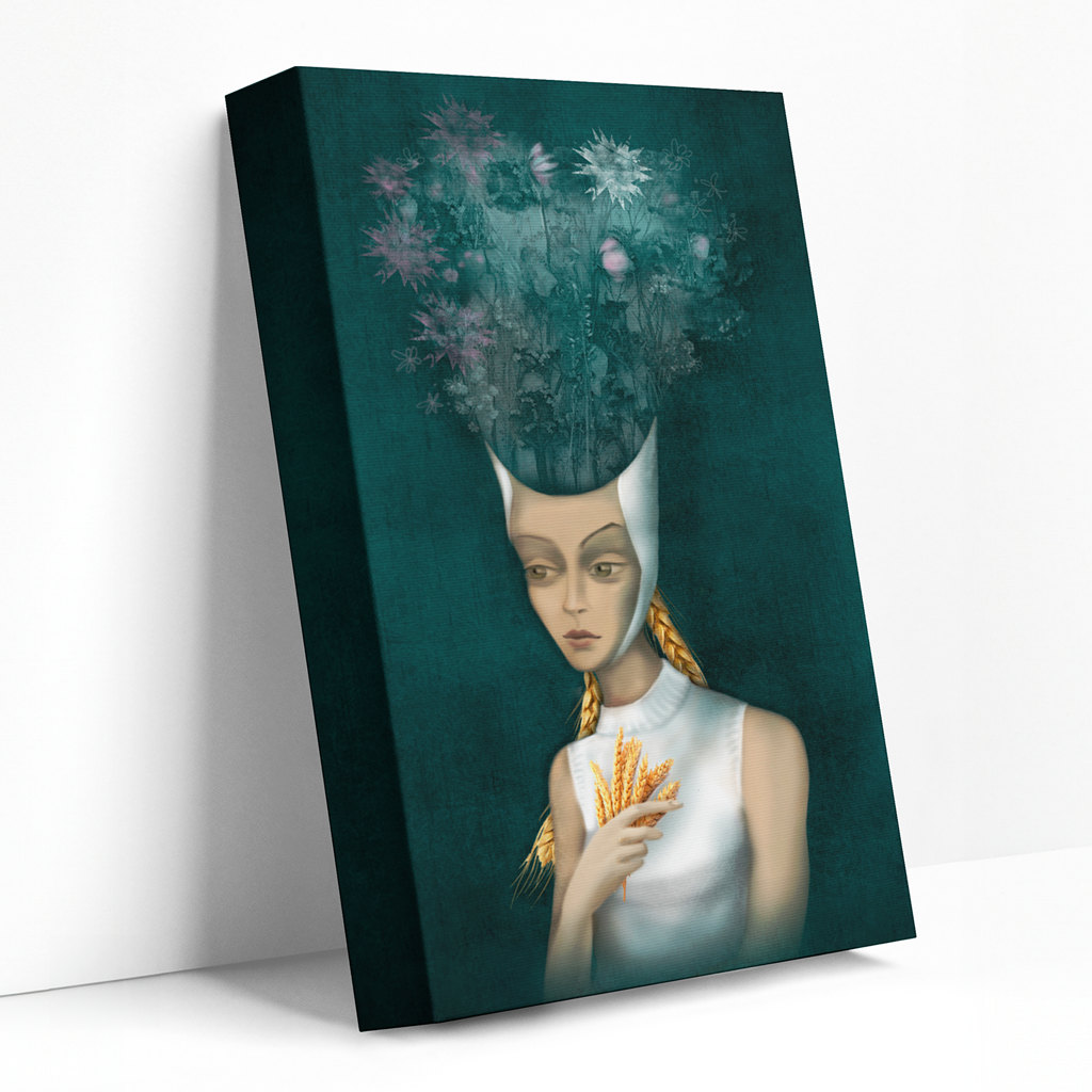 The stunning Zodiac series is now available in breathtaking, ready-to-hang, stretched canvas form. Sona Babajanyan's exceptional talent for reinterpreting the Zodiac signs is on full display in this captivating piece, which offers a fresh and intriguing take on the traditional Virgo symbol.